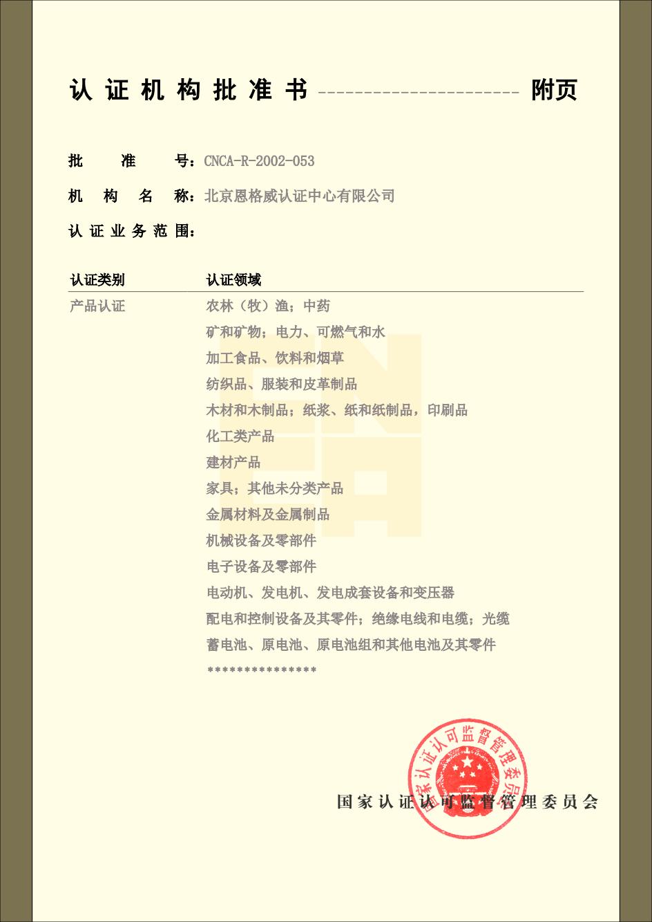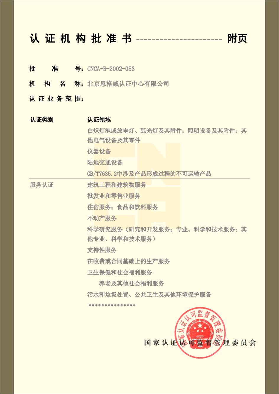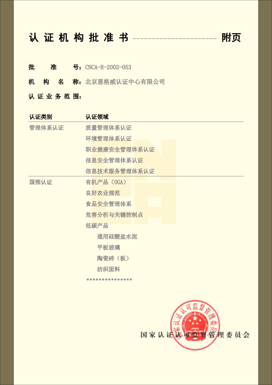 北京恩格威认证中心有限公司(简称恩格威,缩写NGV),成立于2001年,是经中国国家认证认可监督管理委员会批准设立,并获中国合格评定国家认可委员会(CNAS)和大洋洲认可委员会(JAS-ANZ)认可,且业务领域齐全、服务网络遍布全国的综合性大型认证机构。同时,是为数不多的荣获高新技术企业认定的第三方认证机构。