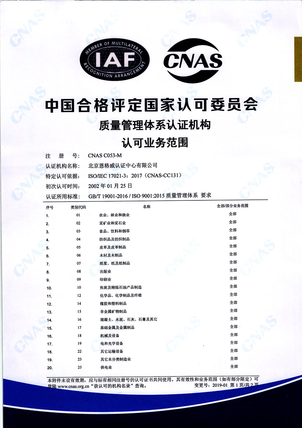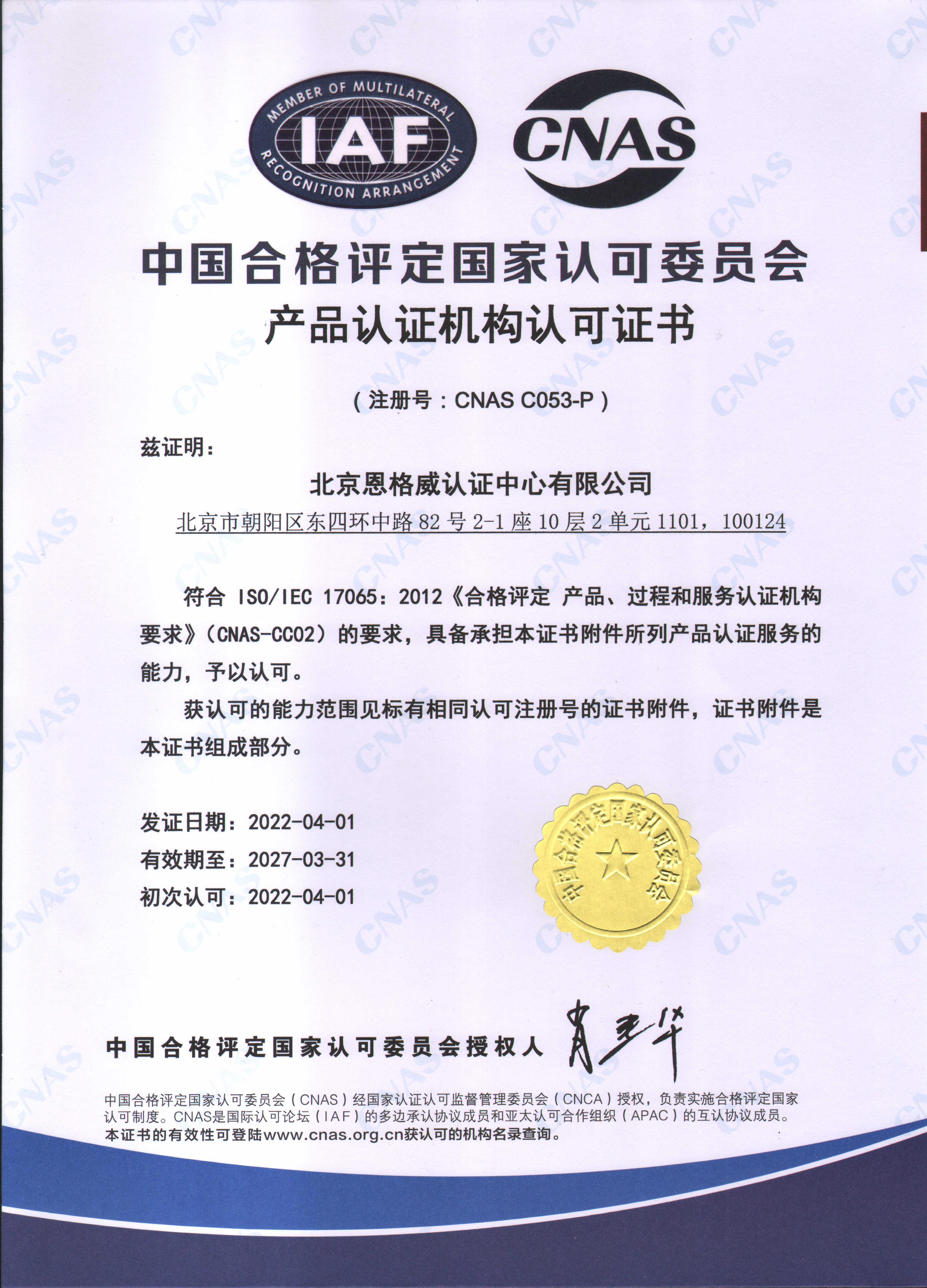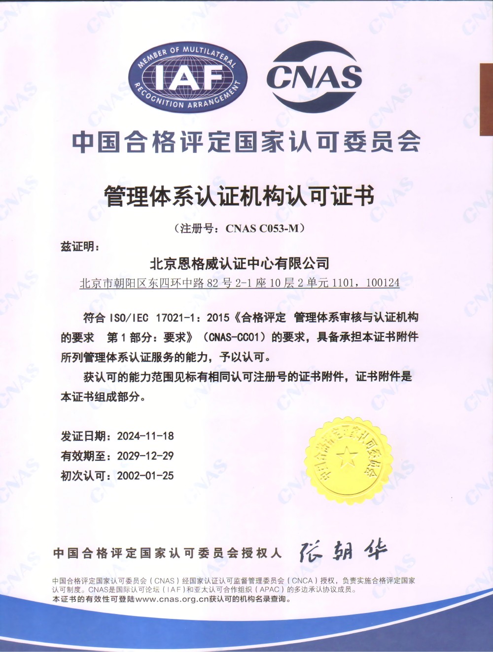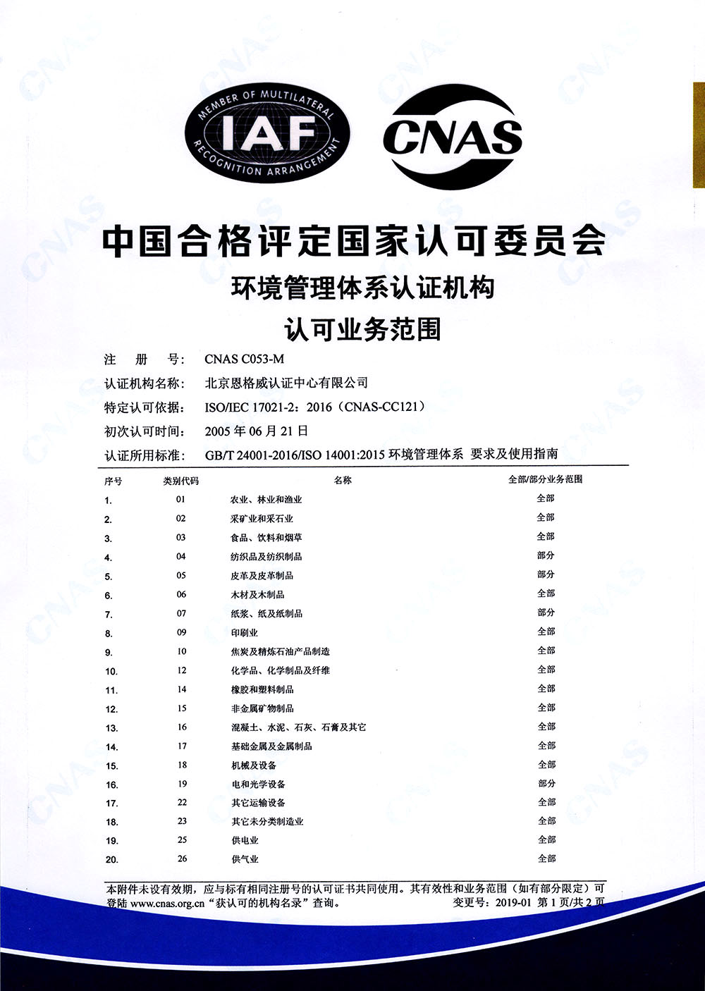 北京恩格威认证中心有限公司(简称恩格威,缩写NGV),成立于2001年,是经中国国家认证认可监督管理委员会批准设立,并获中国合格评定国家认可委员会(CNAS)和大洋洲认可委员会(JAS-ANZ)认可,且业务领域齐全、服务网络遍布全国的综合性大型认证机构。同时,是为数不多的荣获高新技术企业认定的第三方认证机构。